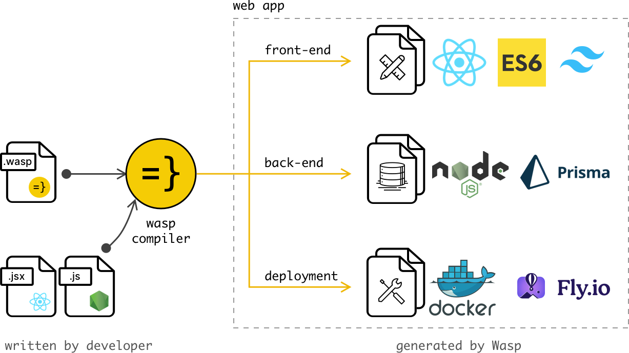 At the core is the Wasp compiler which takes the Wasp config and your Javascript code and outputs the client app, server app and deployment code.